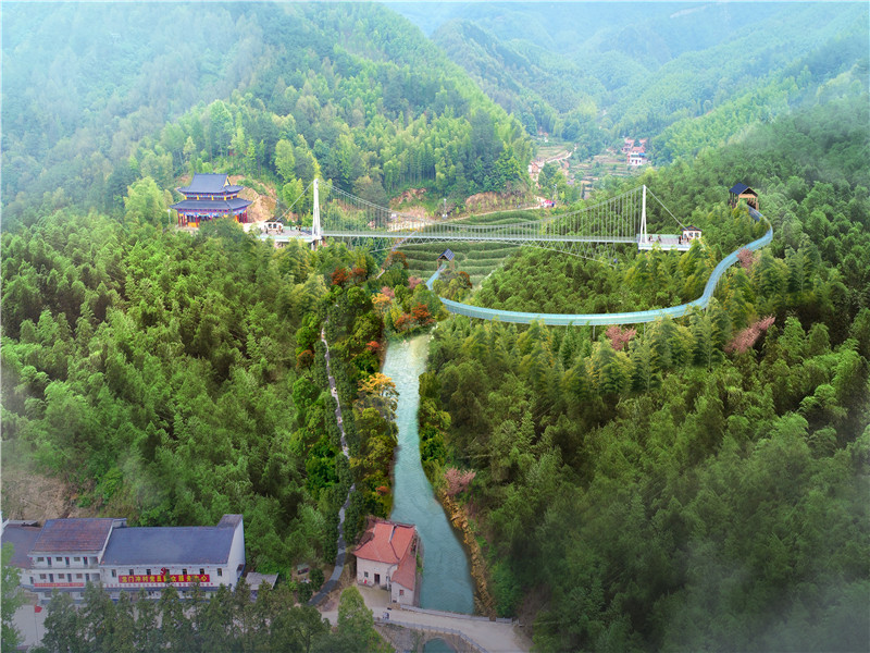 人行悬索玻璃吊桥,吊桥宽度2.5/3米,护栏采用弧形护栏高度为1.2米,玻璃采用3层夹胶10MM。桥梁两侧采用重力式锚定,主缆为高强钢丝绳。
