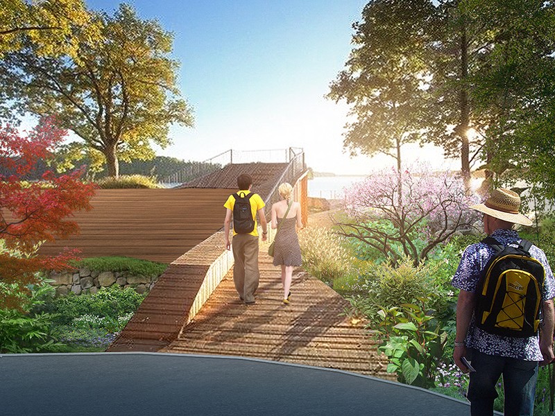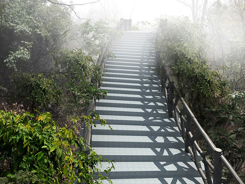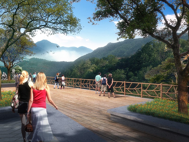 整个栈道,或石块铺地,或栈桥凌空。无论路、桥、亭、阁,都充盈着山林野趣。在建筑风格上,它们朴素洁雅又灵活多姿。在栈道上,有的亭阁依树而立,有的以树为中柱,迥心式景亭。人们向树小憩,临阁观景,别有一番风味。